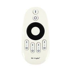 Pilot 4-strefowy MONO FUT006 Mi-Light. Model FUT006 to pilot przeznaczony do obsługi oświetlenia jednobarwnego LED oraz taśm Dualcolor. Pilot pracuje w systemie 4-strefowym. Do każdej strefy można przypisać dowolną ilość odbiorników serii Mi-Light (sprzedawane osobo), zatem możliwość konfiguracji jest praktycznie nieskończona. Pilot umożliwia płyną regulację jasności oraz temperatury barwowej światła białego za pomocą obrotowego pokrętła.